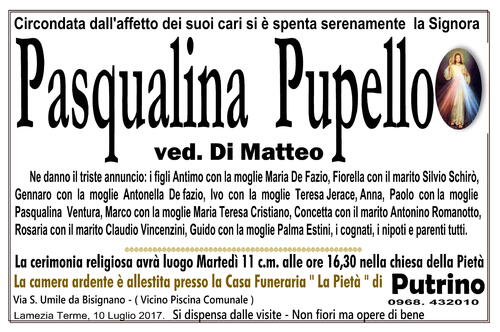 La cerimonia religiosa avrà luogo Martedì 11 c.m. alle ore 16,30 nella chiesa della Pietà di Putrino