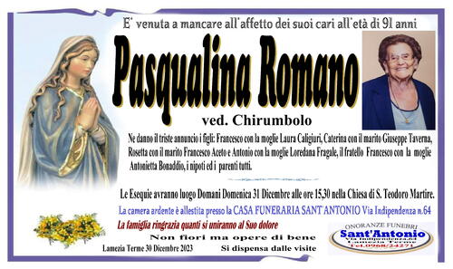 Ne danno il triste annuncio i figli: Francesco con la moglie Laura Caligiuri, Caterina con il marito Giuseppe Taverna, Rosetta con il marito Francesco Aceto e Antonio con la moglie Loredana Fragale, il fratello Francesco con la moglie Antonietta Bonaddio i nipoti ed i parenti tutti.