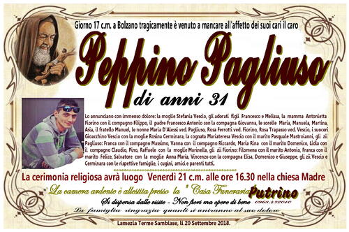 La camera ardente è allestita presso la '' Casa Funeraria'' PUTRINO