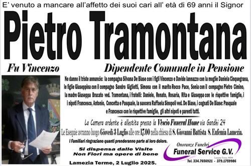 Le Esequie avranno luogo Giovedì 3 Luglio alle ore 17.00 nella chiesa di S. Giovanni Battista S. Eufemia Lamezia.