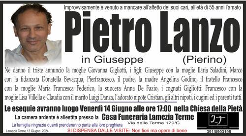 Ne danno il triste annuncio la moglie Giovanna Gigliotti, i figli: Giuseppe con la moglie Ilaria Saladini, Marco