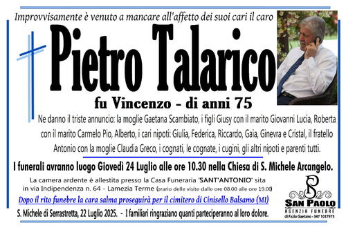 I funerali avranno luogo Giovedì 24 Luglio alle ore 10.30 nella Chiesa di S. Michele Arcangelo.