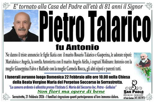 I funerali avranno luogo Domenica 22 Febbraio alle ore 10.00 nella Chiesa