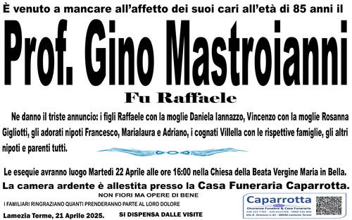 Le esequie avranno luogo Martedì 22 Aprile alle ore 16:00 nella Chiesa della Beata Vergine Maria in Bella.