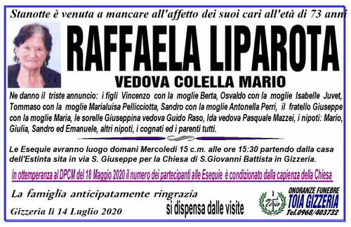Le Esequie avranno luogo domani Mercoledi 15 c.m. alle ore 15:30 partendo dalla casa