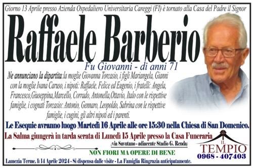 Lamezia Terme, lì 14 Aprile 2024 - Si dispensa dalle visite - La Famiglia Ringrazia anticipatamente.