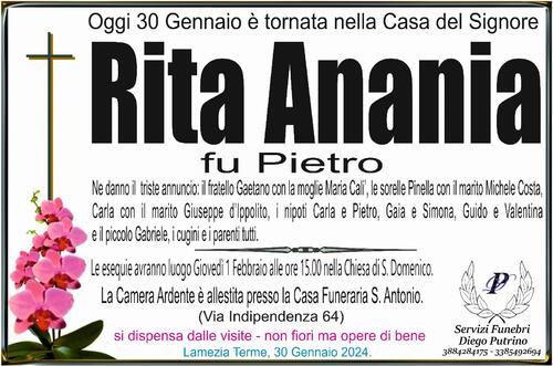 Ne danno il triste annuncio: il fratello Gaetano con la moglie Maria Cali’, le sorelle Pinella con il marito Michele Costa, Carla con il marito Giuseppe d’Ippolito, i nipoti Carla e Pietro, Gaia e Simona, Guido e Valentina e il piccolo Gabriele, i cugini e i parenti tutti.Le esequie avranno luogo Giovedì 1 Febbraio alle ore 15.00 nella Chiesa di S. Domenico.