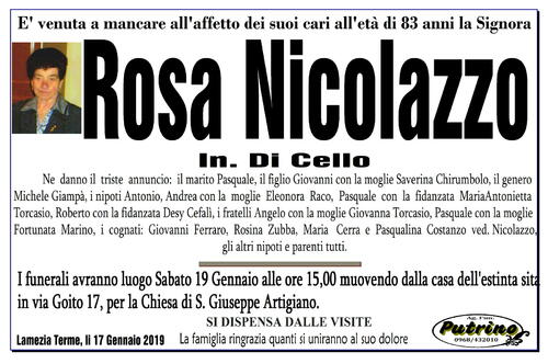 I funerali avranno luogo Sabato 19 Gennaio alle ore 15,00 muovendo dalla casa dell'estinta sita