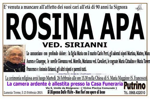 La camera ardente è allestita presso la Casa Funeraria PUTRINO