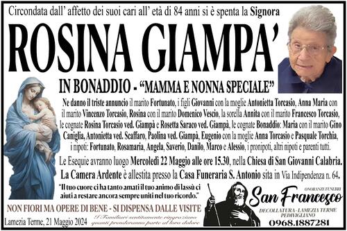 Ne danno il triste annuncio il marito Fortunato, i figli Giovanni con la moglie Antonietta Torcasio, Anna Maria con
