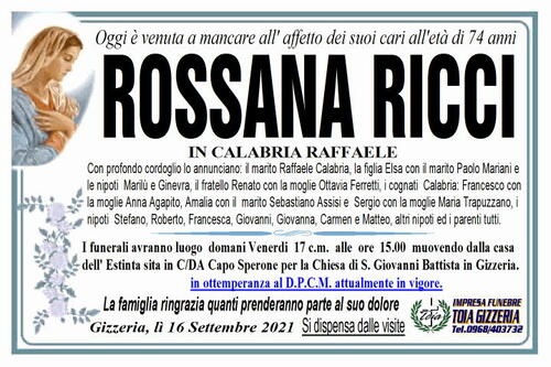Con profondo cordoglio lo annunciano: il marito Raffaele Calabria, la figlia Elsa con il marito Paolo Mariani e