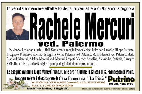 Le esequie avranno luogo Venerdì 19 c.m. alle ore 11,00 nella Chiesa di S. Francesco di Paola.