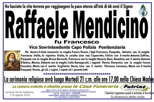 La camera ardente è allestita presso la Casa Funeraria Putrino