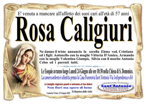 Ne danno il triste annuncio la sorella Elena ved. Cristiano ed i figli: Antonello con la moglie Vittoria D'Amico, Armando con la moglie Valentina Giampà, Silvia con il marito Antonio Celso ed i parenti tutti.