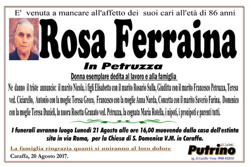 I funerali avranno luogo Lunedì 21 Agosto alle ore 16,00 muovendo dalla casa dell'estinta sita in via Roma, per la Chiesa di S. Domenica V.M. in Caraffa.
