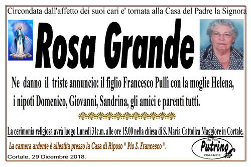 La cerimonia religiosa avrà luogo Lunedì 31c.m. alle ore 15.00 nella chiesa di S. Maria Cattolica Maggiore in Cortale.
