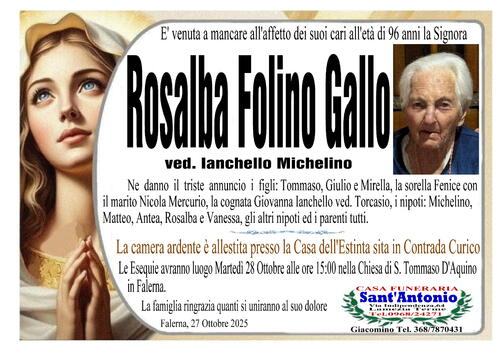 Ne danno il triste annuncio: i figli: Tommaso, Giulio e Mirella, la sorella Fenice con il marito Nicola Mercurio, la cognata Giovanna Ianchello ved. Torcasio, i nipoti: Michelino, Matteo, Antea, Rosalba e Vanessa, gli altri nipoti e parenti tutti.