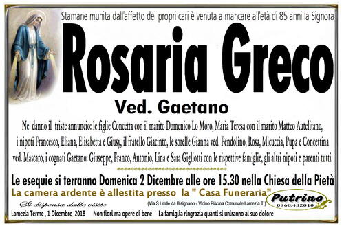 ved. Mascaro, i cognati Gaetano: Giuseppe, Franco, Antonio, Lina e Sara Gigliotti con le rispettive famiglie, gli altri nipoti e parenti tutti.