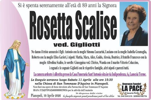 Le Esequie avranno luogo Sabato 11 Aprile alle ore 15:30 nella Chisa di San Tommaso D'Aquino in Pianopoli.