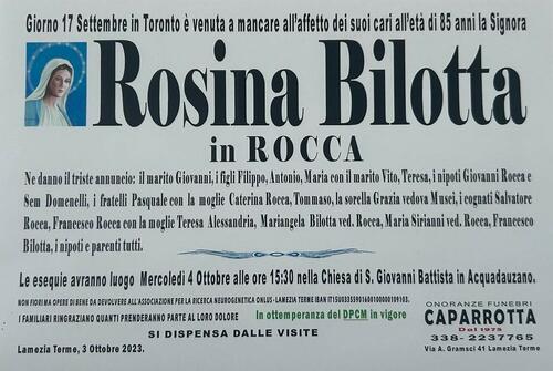 Ne danno il triste annuncio: il marito Giovanni,i figli Filippo, Antonio, Maria con il marito Vito, Teresa, i nipoti Giovanni Rocca e Sem Domenelli, i fratelli Pasquale con la moglie Caterina Rocca, Tommaso, la sorella Grazia vedova Musci, i cognati Salvatore Rocca, Francesco Rocca con la moglie Teresa Alessandria, Mariangela Bilotta ved. Rocca, Maria Sirianni ved. Rocca, Francesco Bilotta, i nipoti e parenti tutti.