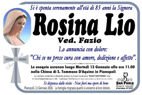 Le esequie avranno luogo Martedì 13 Gennaio alle ore 11.00