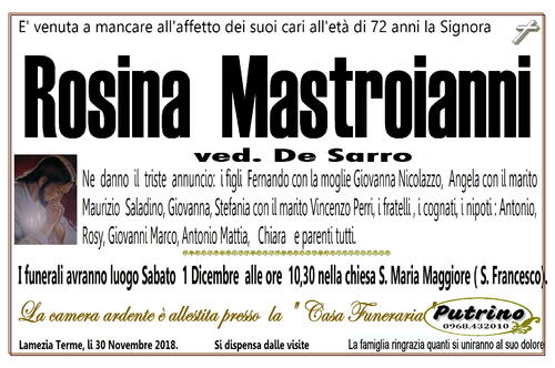 I funerali avranno luogo Sabato 1 Dicembre alle ore 10,30 nella chiesa S. Maria Maggiore ( S. Francesco).