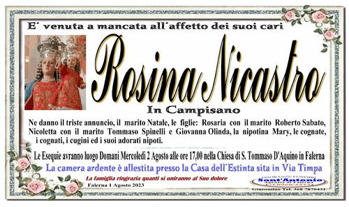 Ne danno il triste annuncio, il marito Natale, le figlie: Rosaria con il marito Roberto Sabato, Nicoletta con il marito Tommaso Spinelli e Giovanna Olinda, la nipotina Mary, le cognate, i cognati, i cugini ed i suoi adorati nipoti.