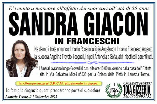 I funerali avranno luogo Giovedì 8 c.m. alle ore 16:00 muovendo dalla casa dell' Estinta