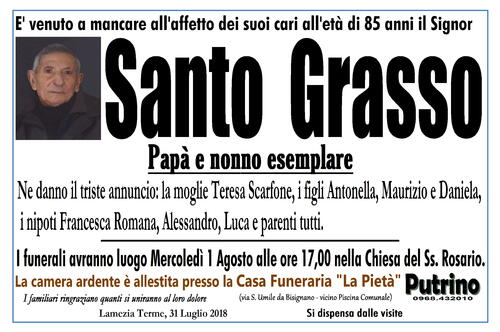 I funerali avranno luogo Mercoledì 1 Agosto alle ore 17,00 nella Chiesa del S.S. Rosario.