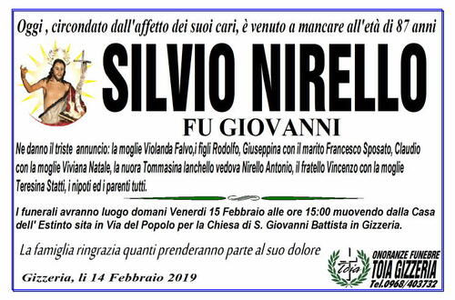 I funerali avranno luogo domani Venerdi 15 Febbraio alle ore 15:00 muovendo dalla Casa