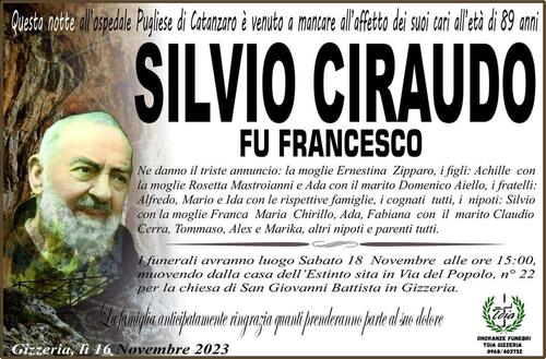 I funerali avranno luogo Sabato 18 Novembre alle ore 15:00,