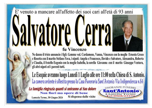 Ne danno il triste annuncio i figli: Gemma ved. Cardamone, Vanna, Vincenzo con la moglie Ernesta Greco e Rosetta con il marito Stefano Fava, i nipoti: Angela e Francesco, Davide e Salvatore, Alessandra, Roberta e Claudia, il fratello Eugenio con la moglie Isabella, la sorella Giovanna con il marito Giuseppe Ventura, gli altri nipoti ed i parenti tutti.