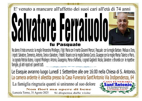 Ne danno il triste annuncio la moglie Vincenzina Mirallegro, i figli: Maria con il marito Giovanni Mercuri, Pasquale con la moglie Barbara Melluso e Dora, i nipoti: Salvatore, Domenico, Antonio, Ilenia e Salvatore, i fratelli: Rosario con la moglie Daniela Curcio, Giuseppe con la moglie Marisa Talarico e Mario, la cognata Patrizia Butera, i cognati Mirallegro: Antonio, Giuseppina, Mena e Raffaella, i cognati Gagliardi: Nicola, Salvatore e Brunella con le rispettive famiglie, gli altri nipoti ed i parenti tutti.