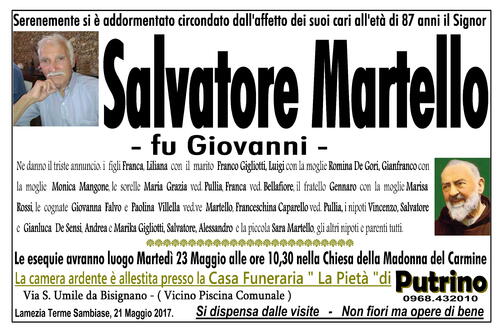 Le esequie avranno luogo Martedì 23 Maggio alle ore 10,30 nella Chiesa della Madonna del Carmine