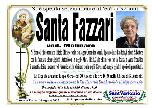 Ne danno il triste annuncio il figlio Michele con la compagna Carmelina Varrà, il genero Enzo Pandolfo, i nipoti: Salvatore con la fidanzata Elena Gigliotti, Antonio con la moglie Maria Pitasi, Carla e Francesco con la fidanzata Anna Morabito,i cognati Adelina Caccamo ved. Fazzari e Mario Molinaro con la moglie Giovanna Strangis, gli altri nipoti e parenti tutti.