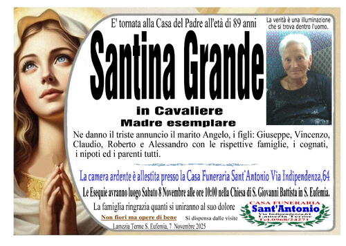 Ne danno il triste annuncio il marito Angelo, i figli: Giuseppe, Vincenzo, Claudio, Roberto e Alessandro con le rispettive famiglie, i cognati, i nipoti ed i parenti tutti.