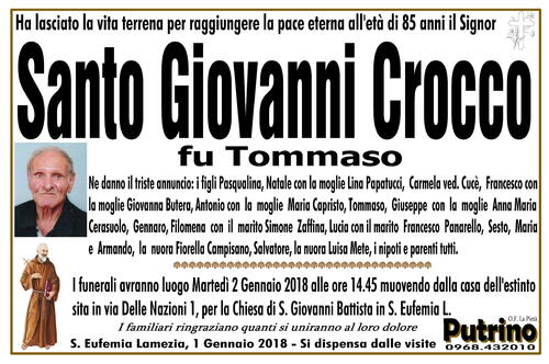 I funerali avranno luogo Martedì 2 Gennaio 2018 alle ore 14.45 muovendo dalla casa dell'estinto
