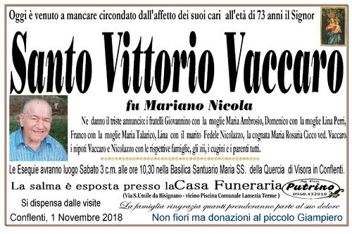 Le Esequie avranno luogo Sabato 3 c.m. alle ore 10,30