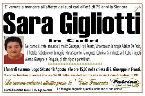 I funerali avranno luogo Sabato 18 Agosto alle ore 15,00 nella chiesa di S. Giuseppe in Fronti.
