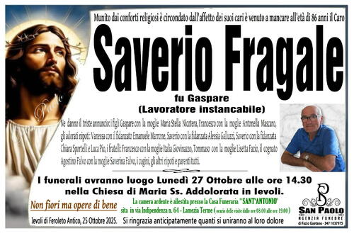 I funerali avranno luogo Lunedì 27 Ottobre alle ore 14.30