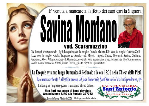 Ne danno il triste annuncio i figli: Pasqualino con la moglie Daniela Maione, Elio con la moglie Caterina Zolli, Luca con la moglie Natalia Tropeano ed Amalia ved. Miceli, i nipoti: Chiara, Giovanni, Savina, Giuliana, Giovanni, Alice, Allegra, Andrea ed Alessandro, i cognati: Rita Scaramuzzino ved.Manasia ed Elio Scaramuzzino con la moglie Francesca Vitetti, il caro Orazio, gli altri nipoti e parenti tutti.