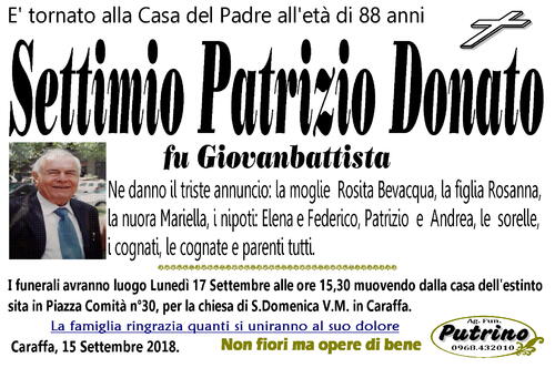 I funerali avranno luogo Lunedì 17 Settembre alle ore 15,30 muovendo dalla casa dell'estinto