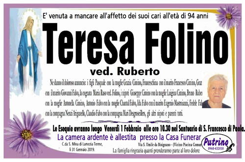 Le Esequie avranno luogo Venerdì 1 Febbraio alle ore 10.30 nel Santuario di S. Francesco di Paola.