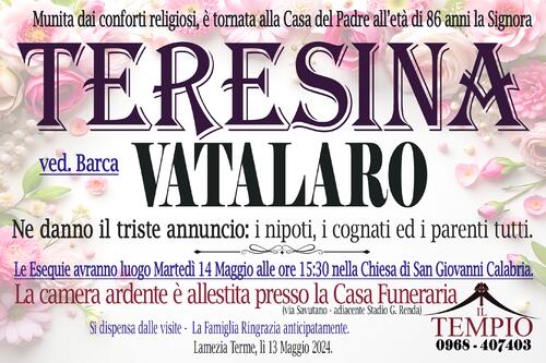 Le Esequie avranno luogo Martedì 14 Maggio alle ore 15:30 nella Chiesa di San Giovanni Calabria.