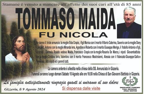 I funerali avranno luogo domani Sabato 10 Agosto alle ore 16:00 nella Chiesa di San Giovanni Battista in Gizzeria.