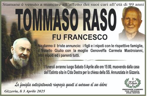 I funerali avranno luogo Sabato 5 Aprile alle ore 15:00, muovendo dalla casa dell'Estinto sita in C/da Destra per la chiesa della SS. Annunziata in Gizzeria.