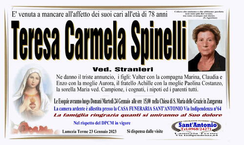 Ne danno il triste annuncio, i figli: Valter con la compagna Marina, Claudia e Enzo con la moglie Aurora, il fratello Achille con la moglie Paolina Costanzo, la sorella Maria ved. Campione, i cognati, i nipoti ed i parenti tutti.