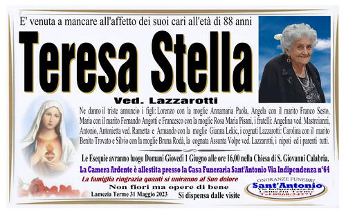 Ne danno il triste annuncio, i figli: Lorenzo con la moglie Annamaria Paola, Angela con il marito Franco Sesto, Maria con il marito Fernando Angotti e Francesco con la moglie Rosa Maria Pisani, i fratelli: Angelina ved. Mastroianni, Antonio, Antonietta ved. Rametta e Armando con la moglie Gianna Lekic, i cognati Lazzarotti: Carolina con il marito Benito Trovato e Silvio con la moglie Bruna Rodà, la cognata Assunta Volpe ved. Lazzarotti, i nipoti ed i parenti tutti.