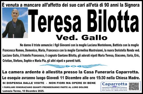 Ne danno il triste annuncio: i figli Giovanni con la moglie Luciana Monteleone, Battista con la moglie Francesca Romeo, Domenico, Maria, Francesco con la moglie Carmelina Mastroianni, la nuora Doristella Renda ved. Luciano Gallo, il fratello Francesco, il cognato Gaetano Bilotta, gli adorati nipoti Maria Teresa, Giacomo, Ilaria, Eric, Cristian, Stefano, Sophie e Maria Pia, gli altri nipoti e parenti tutti.