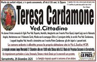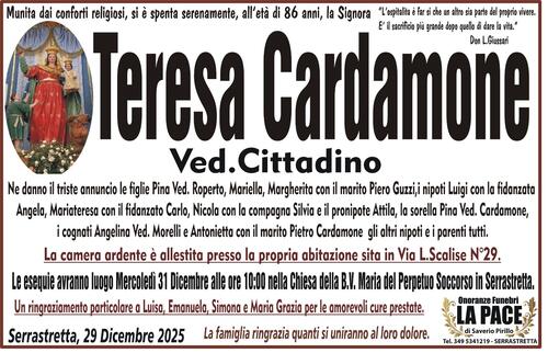 Ne danno il triste annuncio le figlie Pina Ved.Roperto, Mariella, Margherita con il marito Piero Guzzi, i nipoti Luigi con la fidanzata Angela, Mariateresa con il fidanzato Carlo, Nicola con la compagna Silvia e il pronipote Attila, la sorella Pina Ved. Cardamone,i cognati Angelina Ved.Morelli e Antonietta con il marito Pietro Cardamone, gli altri nipoti e i parenti tutti.